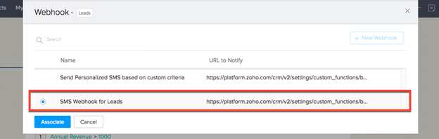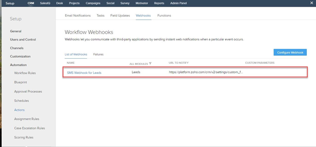 your Zoho CRM. This article will run you through the steps to setup SMS automation using webhooks. You can customise these webhooks to interact with specific modules and what SMS templates to be sent. Workflow rules will be able to use these newly created webhooks as actions.